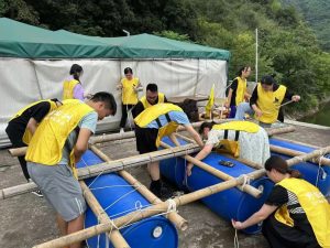 午餐過后,大家來到了青沐寨露營地,進行一場“扎筏泅渡”的戶外比賽。比賽要求每組隊員在特定的時間內,利用所給地毛竹、麻繩、大塑料桶扎出結實的竹筏,隨后乘竹筏抵達目的地。“扎筏泅渡”項目體現的是個體的利益將與團隊的利益緊緊結合在一起,讓大家在親身體驗的過程中了解群策群力的重要性,也培養了隊員們溝通、學習與統籌的能力。